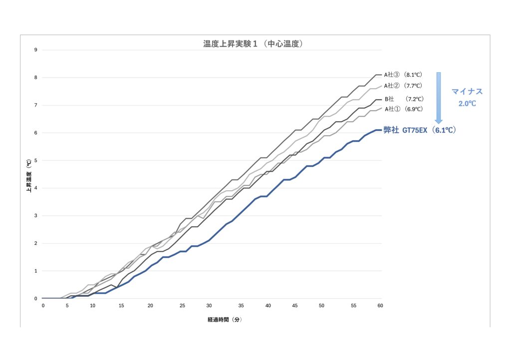 実験結果はグラフの通りになりました。実験開始5分前後から箱の内部温度が上昇し始め、60分後には約6〜8℃内部の温度が上昇しました。今回の実験で用いたフィルムは某大手有名メーカーの最も人気があるシリーズです。そんな大手他社製品以上に内部の温度上昇を抑え、最大で2.0℃他社よりも低い結果となりました!